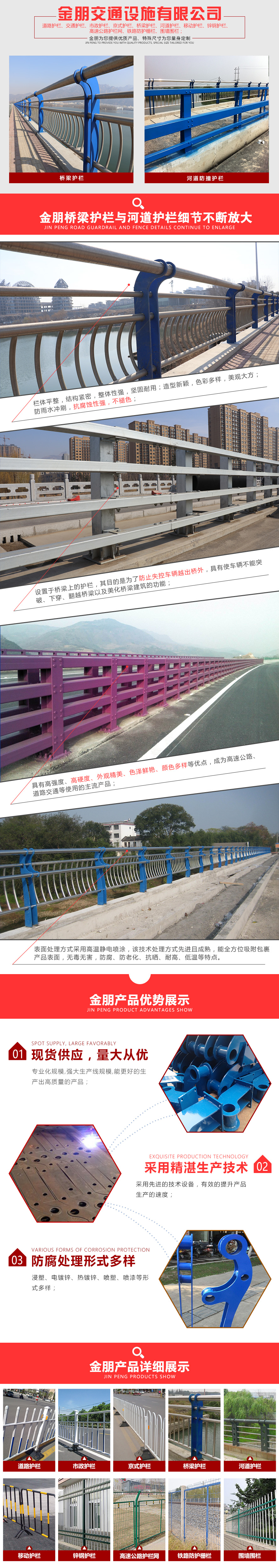 河道護欄用優(yōu)質(zhì)熱鍍鋅板加工而成,從內(nèi)到外防止鋼鐵基材的生銹。并經(jīng)過脫脂、清洗、表調(diào)、磷化、噴洗、干燥、噴粉、固化等工藝處理。色澤持久而鮮亮,達到十年面維修的使用要求。